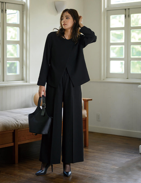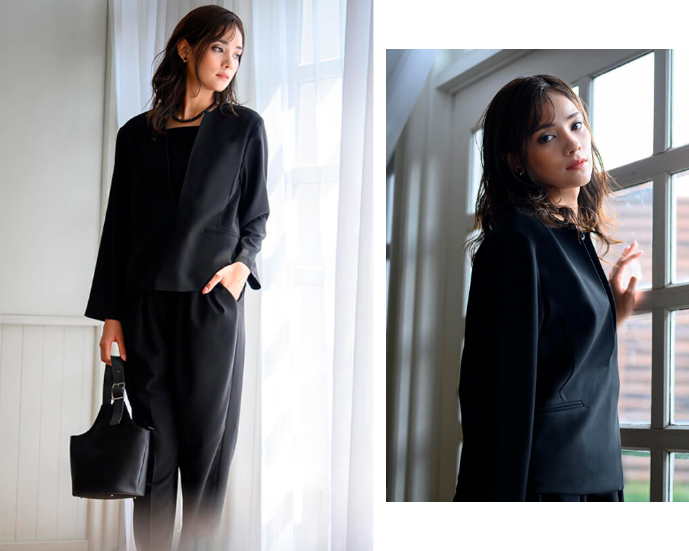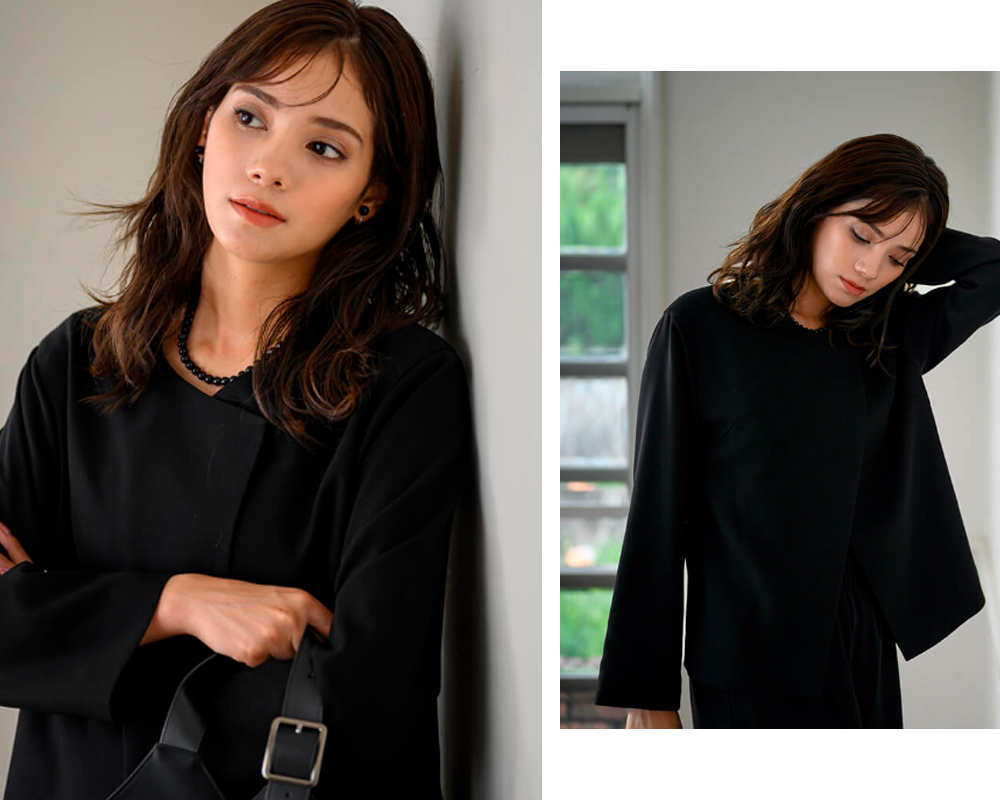 例えば、お葬式やお通夜のスタイリングから、アクセサリーを変えることで卒業式のママスタイルまで着まわせるということです。