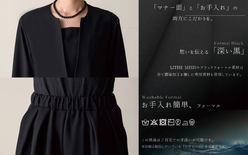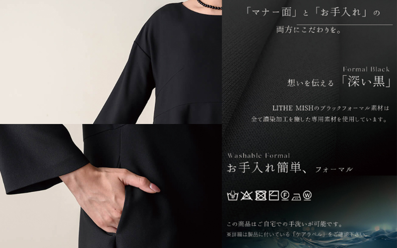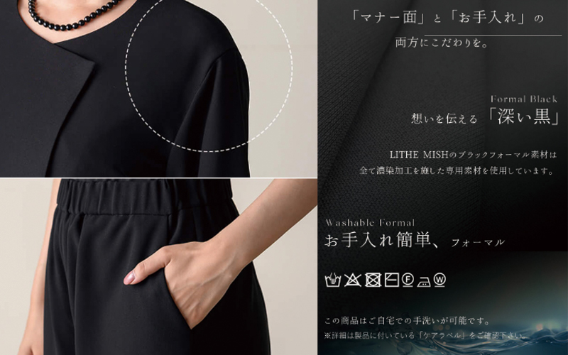 LITHE MISH(リトミッシュ)の喪服(ブラックフォーマル)は、見た目のおしゃれさだけではなく、便利な機能やストレスのない着心地がディティールのデザインにちりばめられています。
