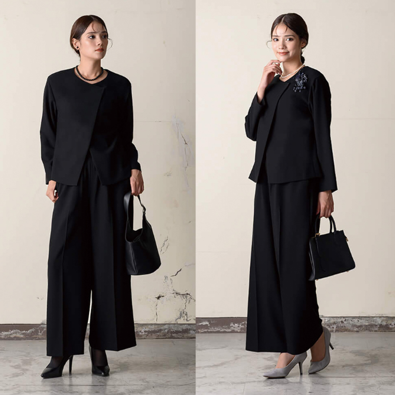 喪服レディース(ブラックフォーマル)として、ルールやマナーの面から多く選ばれるのはワンピーススーツですが、喪服のマナーを守ったパンツスーツであれば葬儀参列に着用は可能です。