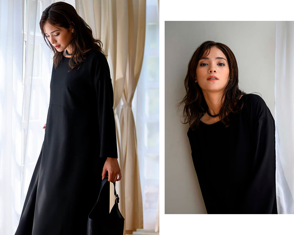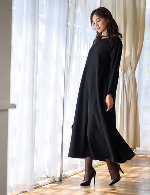 余計なディティールが無く、シックで洗練されたロングワンピースは、ブラックドレスとして1着お持ちいただくのもおススメです。