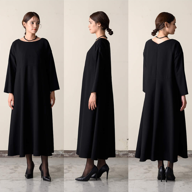 この商品は、喪服のワンピースには珍しいドロップショルダーになっている為、身頃のボリュームも相まってとても楽な着心地になっています。
