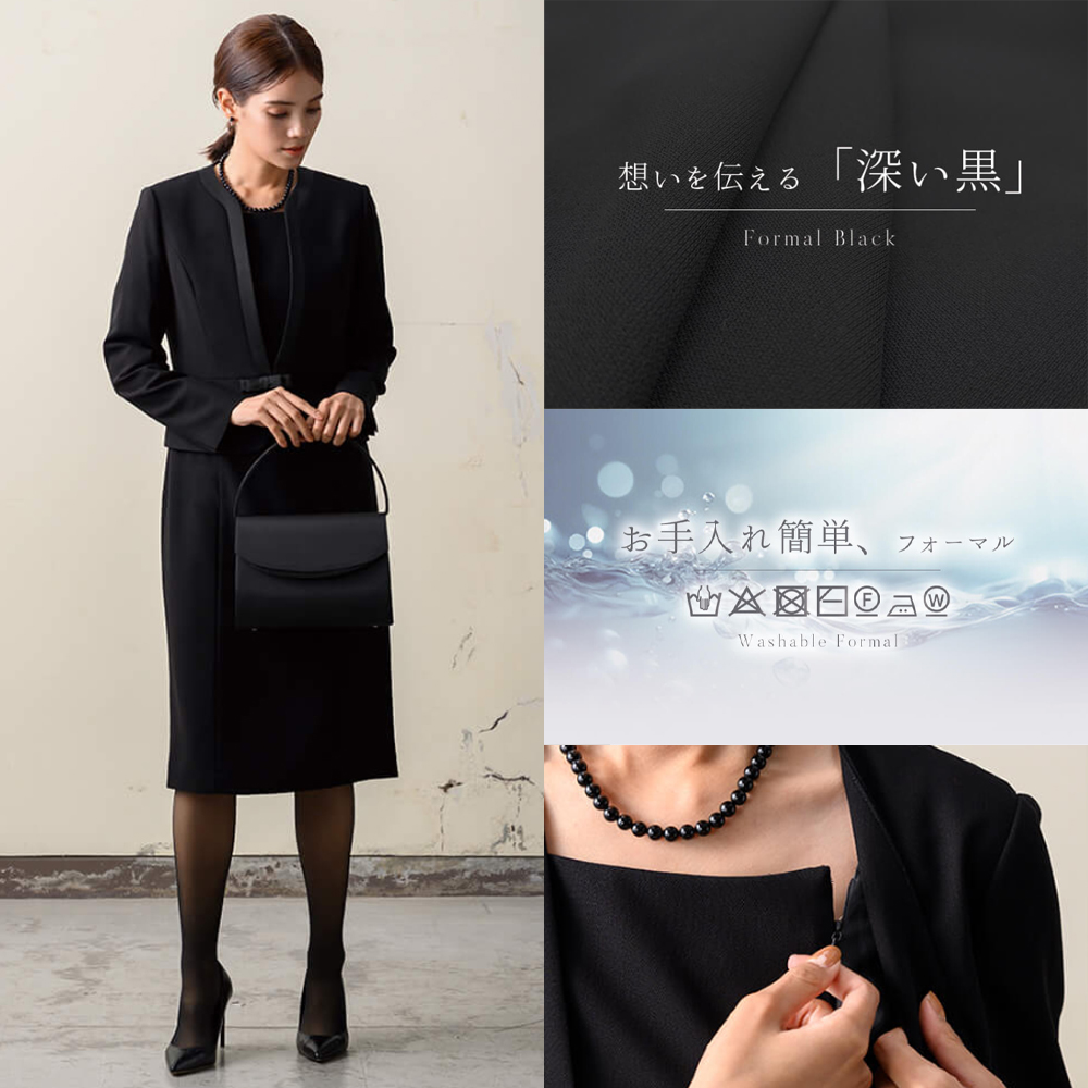 機能面は、「洗えるブラックフォーマル専用の素材」とワンピースの開きが「前ファスナー仕様で着脱に便利」になっています。